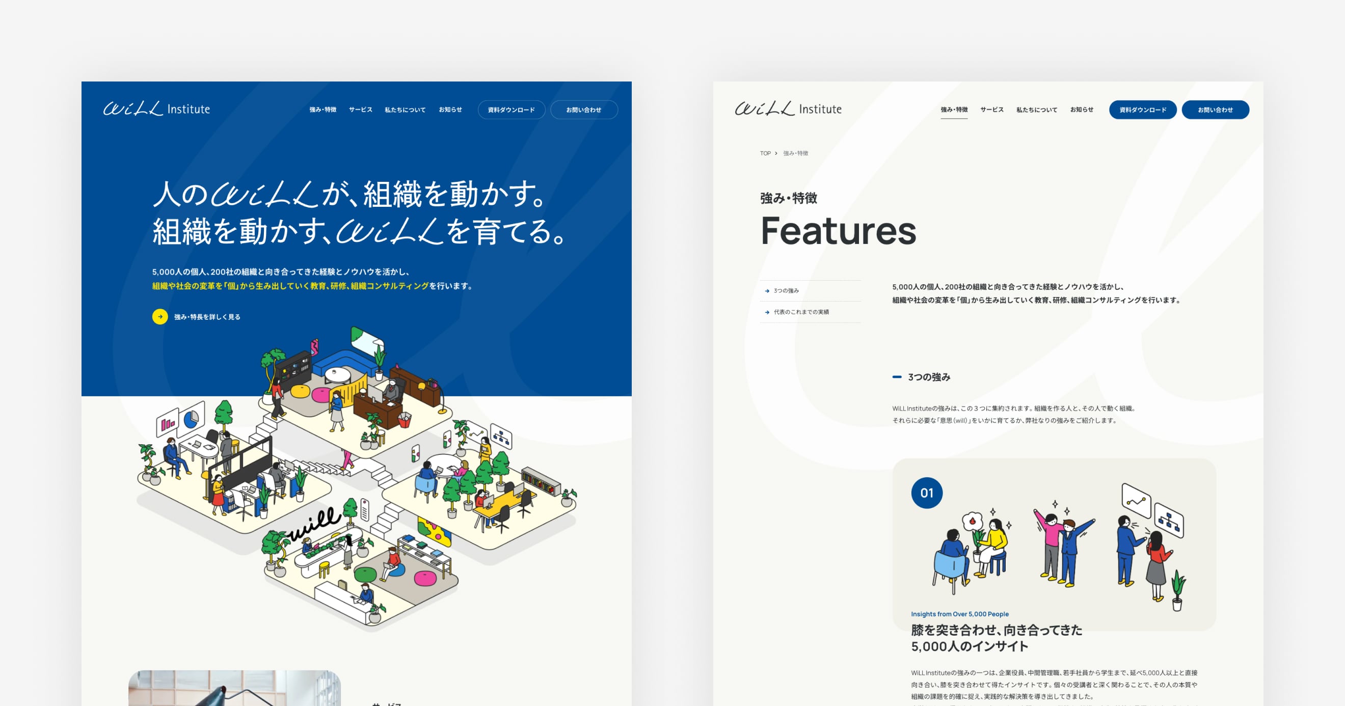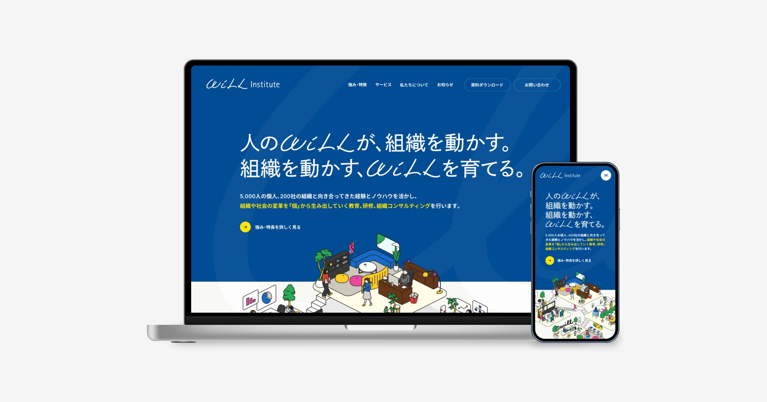 WiLL Institute株式会社さまのコーポレートサイトを制作させていただきました。WiLL Instituteさまは、5,000人を超える個人、200社以上の組織に向き合ってきた豊富な経験と知見をもとに、「個」から組織や社会に変革をもたらす教育・研修・組織コンサルティングを提供する企業です。コンサルティングや研修というと、どうしても“堅さ”や“ロジカルさ”が前面に出がちですが、WiLL Instituteさまはそこに「人のwill」や「熱量」を大切にする姿勢をプラスし、温かみとやわらかさをもって組織の成長をサポートしています。