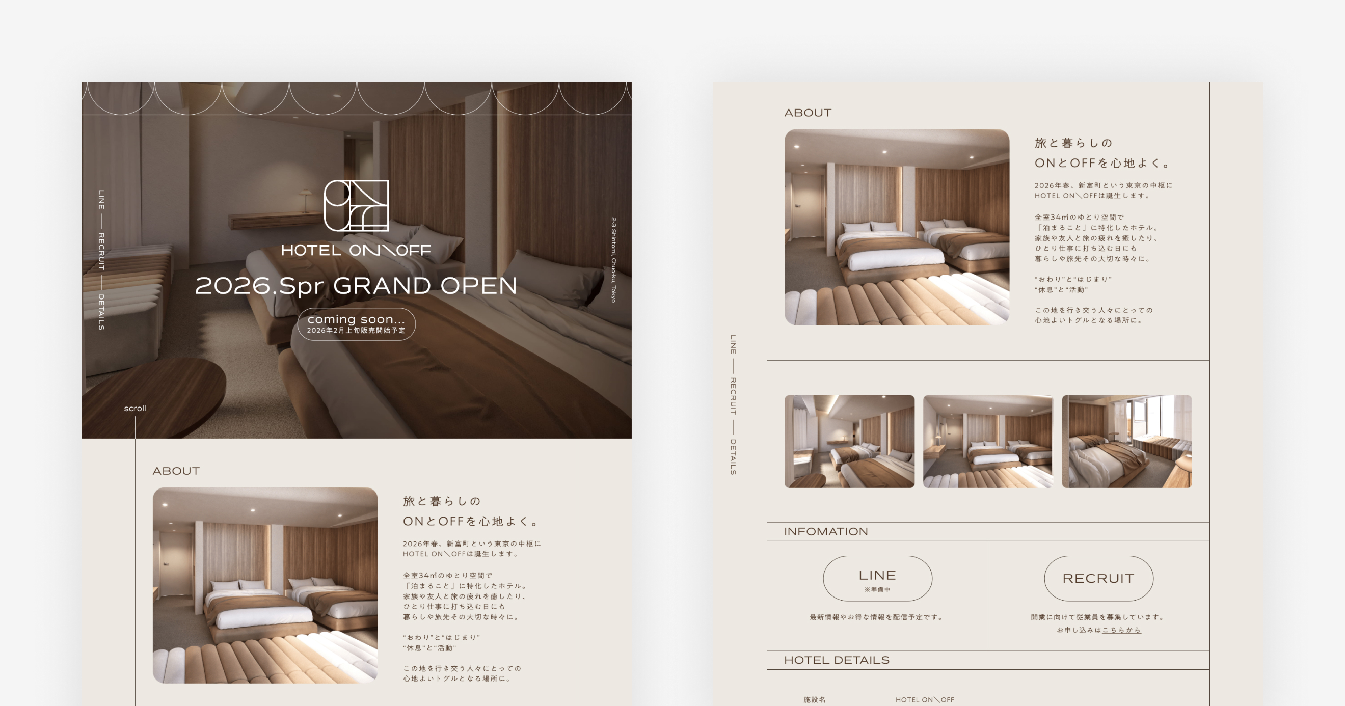 東京都中央区の新富町に、2026年春にオープン予定のホテル「HOTEL ON\OFF」のブランディングおよびティザーサイト制作を行いました。