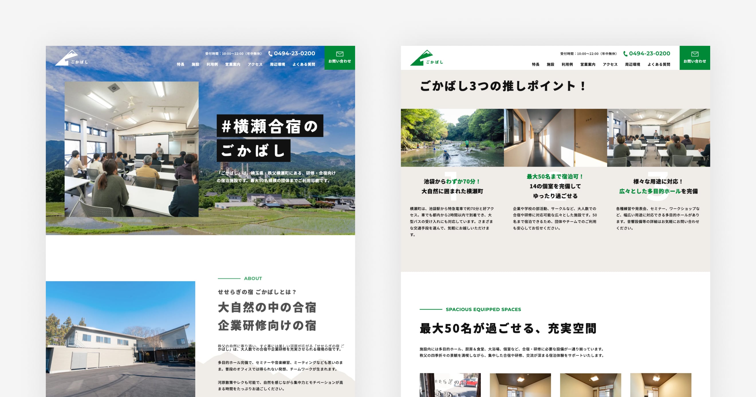 トップページのファーストビュー(FV)では「#横瀬合宿」というハッシュタグをキャッチコピーとして大きく打ち出し、SNSや検索で話題になりやすいキーワードを活用。アクセスの良さや自然の魅力が一目で伝わるように構成しました。