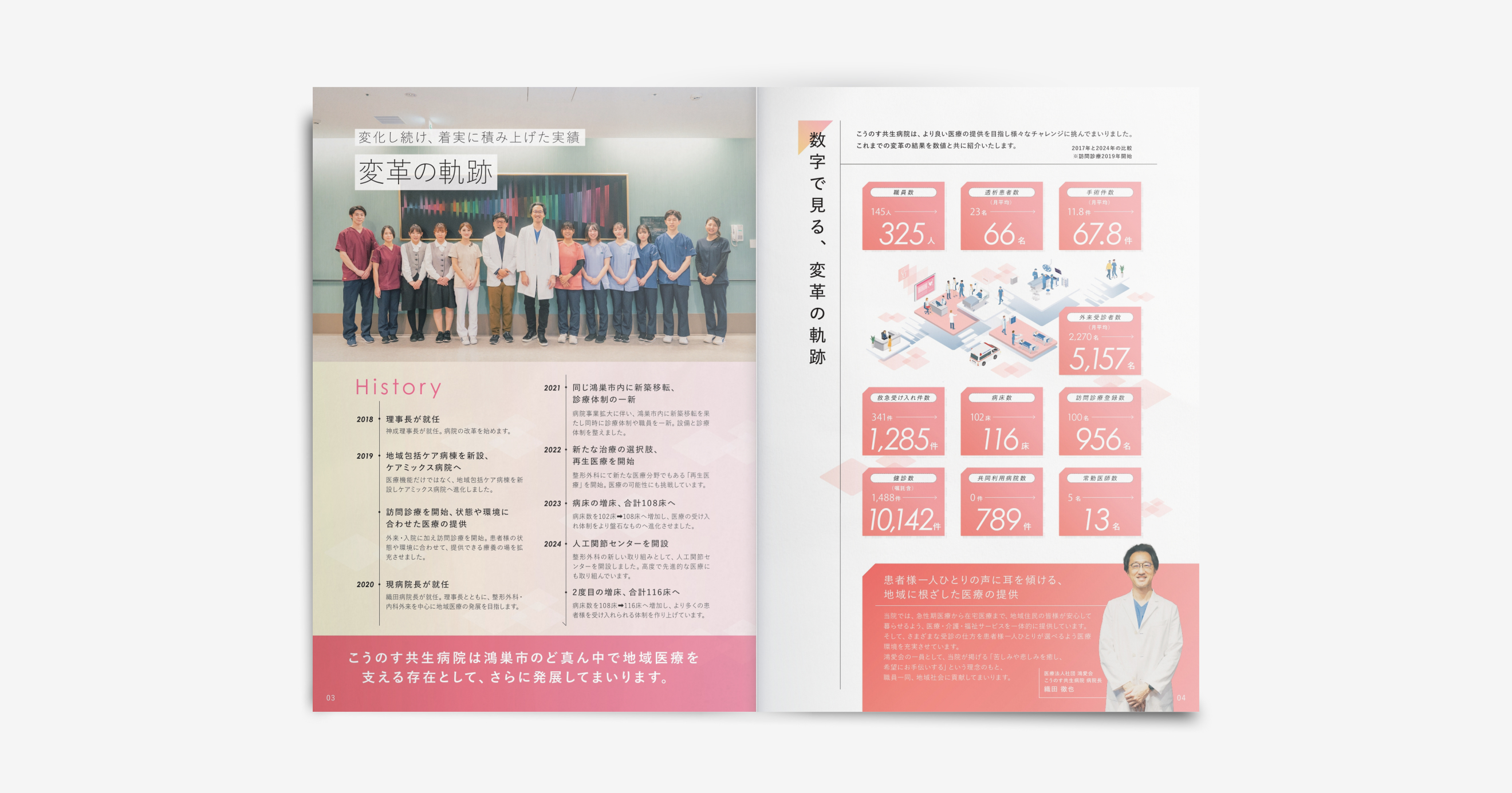 そんなこうのす共生病院さまの病院全体を紹介する32ページの見応えあるパンフレットです。