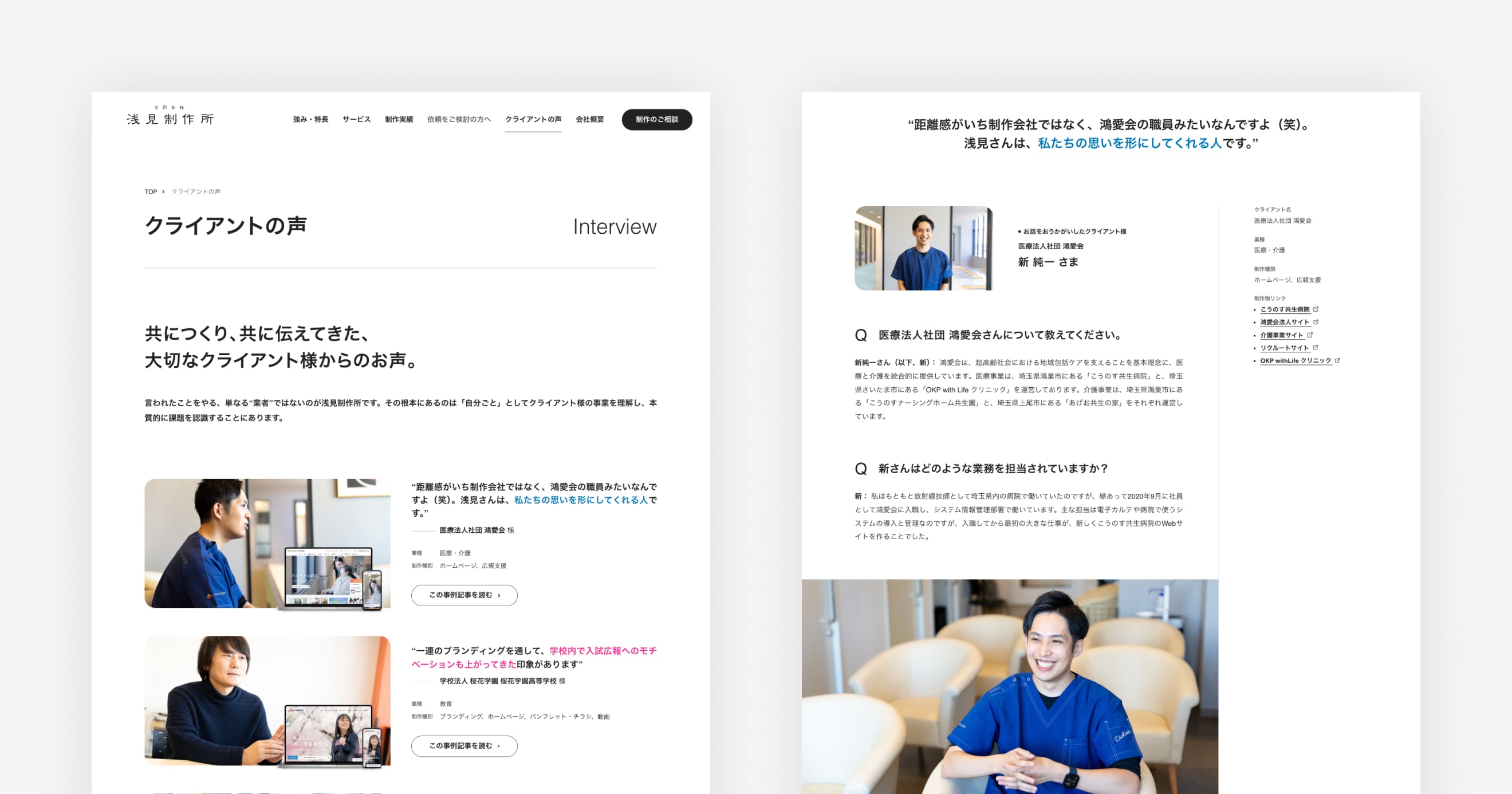 私たち浅見制作所は「誠実でしっかりやり切る」をモットーに、多くのクライアント様から信頼をいただいてきました。その結果として、数多くの制作実績やインタビューを掲載できるサイトを構築し、エビデンスを積み重ねることでさらなる信頼と安心を提供できると考えています。