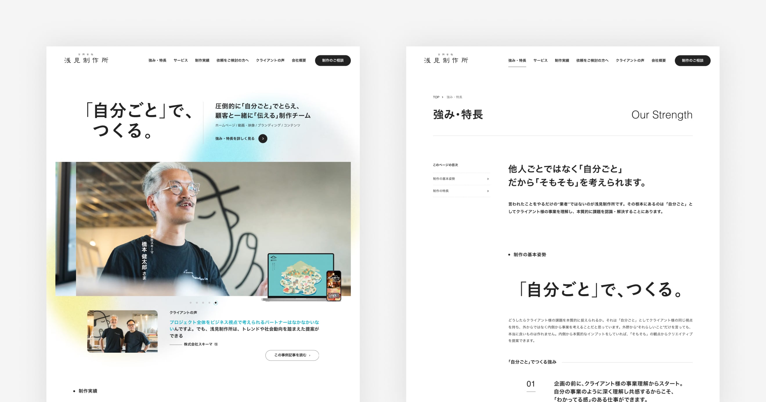 今回のサイトでは、制作姿勢やスタンスをできる限り詳細に書き込みました。写真やデザインだけではなく、考え抜いた言葉を通じて「誠実にやり切る」姿勢を理解していただきたいと思ったからです。すべての文章は浅見自身がライティングし、制作への想いや強み、実際のプロセスをダイレクトにお伝えしています。