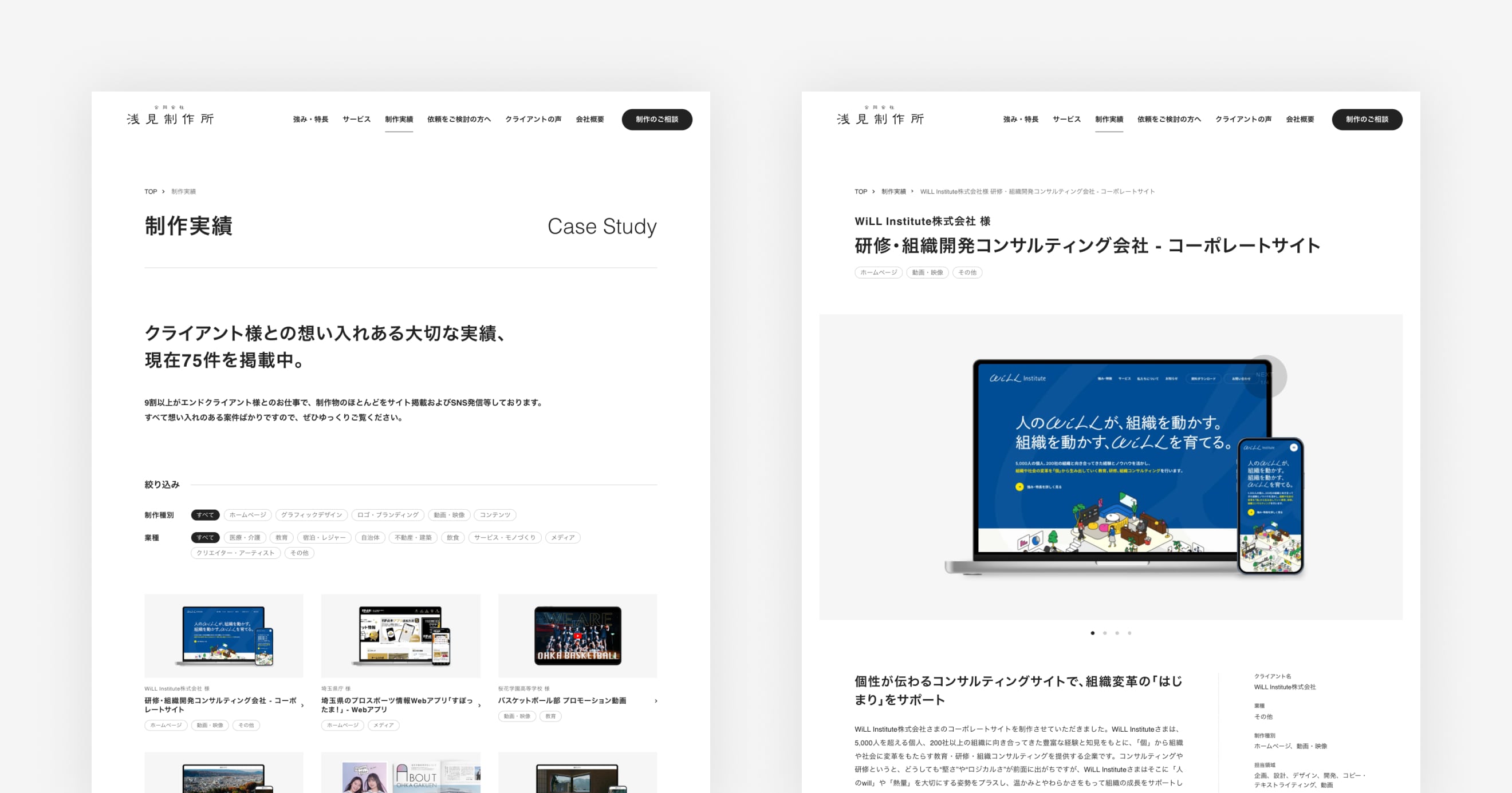 弊社、合同会社 浅見制作所の公式サイトを大幅にリニューアルいたしました。私たちは常に“クライアントさまと共に作る”を心がけており、その姿勢をこのサイト上でも余すことなく伝えたいと考えています。サイト内には実際にご依頼いただいたクライアント様へのインタビュー記事を多数掲載し、その声を「リアルなエビデンス」としてお届けできるよう工夫しました。制作実績の豊富さだけでなく、一つひとつの案件に込めたこだわりと、完成までのストーリーもしっかりお伝えしています。